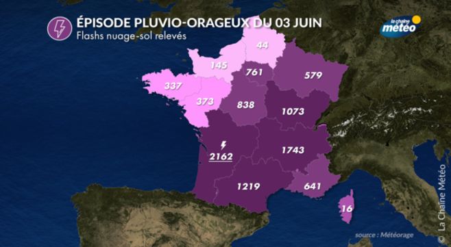 Avec 9931 éclairs nuages-sol (foudre) (source Météorage), la journée d'hier fut la seconde la plus foudroyée depuis le début d'année, après celle du 9 mai (12 304 impacts). Elle fait suite à 5 mois d'une faible activité électrique avec un nombre d'éclairs nuages-sol inférieur de 38% à la moyenne sur 30 ans, en raison de la prédominance des hautes pressions sur le pays.