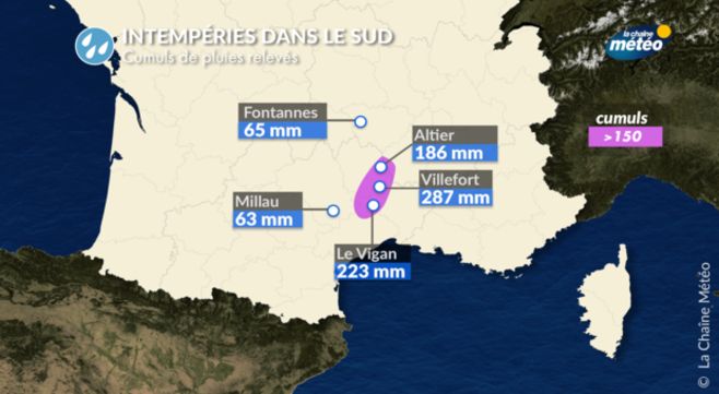 C’est sur le département de la Lozère que les pluies parfois orageuses sont les plus importantes avec 100 à 230 mm tombés sur une grande partie du département. Il est notamment tombé à Villefort 228 mm en 8h, soit l’équivalent de 2 mois et demi de pluies. C’est un record battu, comme probablement dans d’autres communes du département. Les autres départements du Massif central et ceux en périphérie ont été moins touchés, avec des pluies fortes davantage localisées et générant des cumuls de 50 à 80 mm. Les cours d’eau ont fortement réagi sur le sud du Massif central, avec La Cèze et le Gardon placés en alerte orange par Vigicrues et nombre d’autres placés en alerte jaune.