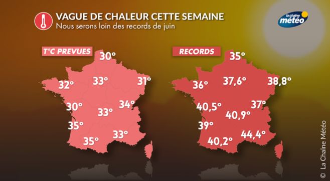 Après une première quinzaine de juin très arrosée et assez fraîche dans l'ouest et le sud, l'anticyclone est de retour cette semaine avec une masse d'air continental très chaude. Les températures font un bond en avant et la barre des 30°C sera dépassée sur les 3/4 du pays entre mardi et mercredi . Rappelons qu'à la même époque, l'année dernière, la France connaissait une canicule historique pendant laquelle presque tous les records de chaleur nationaux ont été battus, au sud de la Loire, tandis que les records pour un mois de juin dataient généralement de 1947 et 1976 au nord de la Loire.