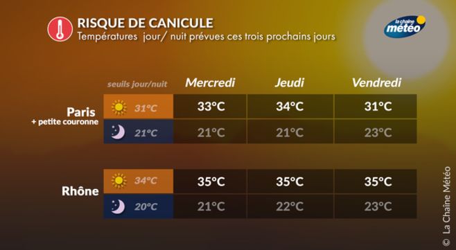 Rappelons qu'une canicule se définit en fonction de seuils de températures, qui doivent rester particulièrement chaudes la nuit et le jour pendant au moins trois jours et trois nuits à la suite. Ces alertes "canicules" sont devenues fréquentes depuis leur création, car une vague de chaleur estivale habituelle peut aboutir à ce genre de situation. Par le passé, ces alertes n'existaient pas et pourtant les vagues de chaleur ont toujours rythmé nos étés. Dans ce contexte, il ne serait pas surprenant que quelques grandes agglomérations frôlent ces seuils entre mercredi et vendredi ou samedi prochain. La région Auvergne-Rhône-Alpes semble être la plus exposée à ce risque à l'heure actuelle, ainsi que l'agglomération parisienne.