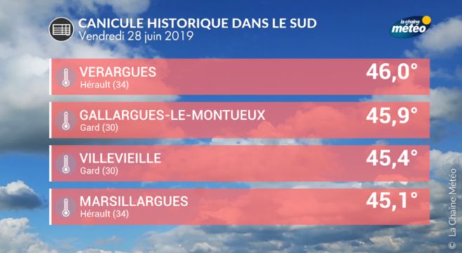 Avec 46°C à Vérargues dans l’Hérault, le record absolu de chaleur avait été enregistré pour la France vendredi 28 juin 2019. Cette vague de chaleur était remontée jusqu'en Anjou et en Touraine où les 40°C avaient été atteints. En plein soleil, le ressenti s'est approché de 55°.
