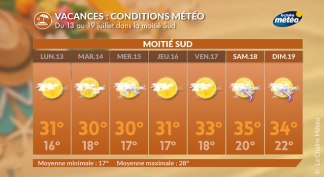 Si l'on excepte une petite dégradation apportant des nuages et un peu de pluie dans le nord et le nord-est pour le 14 juillet, le temps s'annonce toujours sec pour cette semaine. Les températures accusent une baisse sensible mercredi et jeudi.