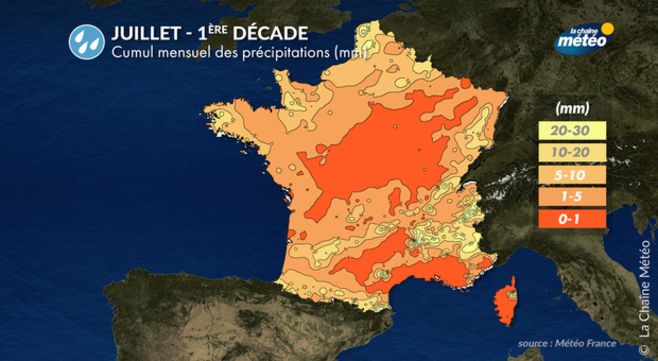 Un déficit de pluie de près de 70% à l'échelle de l'hexagone depuis ce début juillet : cette première décade est la plus sèche depuis 1958. Grâce au bon remplissage des nappes phréatiques au printemps, seuls les sols superficiels souffrent de ce manque de pluie, notamment sur les régions de la moitié nord-est, où le printemps avait déjà été sec. Le sud-ouest et le centre-est sont moins défavorisés en raison d'orages, mais ceux-ci devenant plus rares et restant ponctuels, la situation risque de se tendre au fil de l'été.
