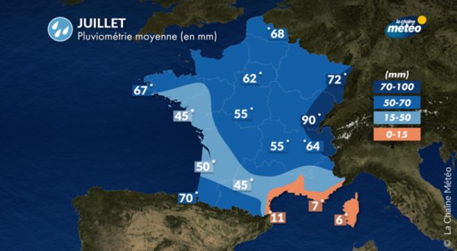Les moyennes statistiques font apparaître une pluviométrie comprise généralement entre 45 et 70 mm pour les mois de juillet, avec des maximums près des reliefs du centre-est : Besançon affiche en moyenne 90 mm en juillet normal, alors qu'il n'est tombé qu'1,2 mm au 13 juillet. De même, Lille enregistre, d'un point de vue statistique, quelques 68 mm en juillet, or il n'est tombé que 8 mm depuis le 1er juillet. Encore pire à Paris et Orléans, où on n'enregistrait même pas 1 mm au 13 juillet, pour une moyenne mensuelle qui devrait être de près de 65 mm lors d'un mois de juillet normal.