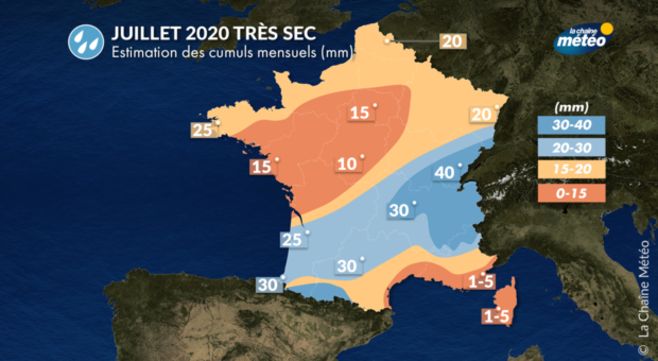 Alors que les températures de ce début d'été en France restent assez proches des moyennes statistiques, la pluviométrie connaît un déficit grandissant. Certaines régions n'ont pas connu une goutte de pluie depuis le début juillet, et la situation ne va pas s'arranger jusqu'à la fin du mois. Certaines modélisations envisagent la poursuite de cette sécheresse jusqu'à l'automne.