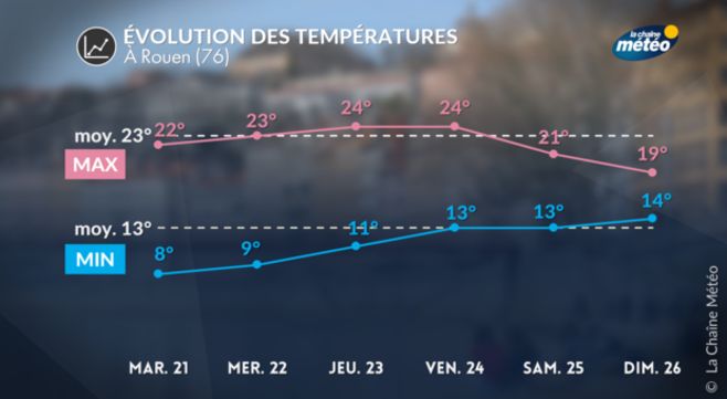 Au nord de la Loire, en raison du vent du Nord-est, les températures afficheront un niveau plus proche des normales de saison avec des minimales entre 8 et 14°C et des maximales de 20°C en bord de Manche à 30°C au niveau de la Loire.