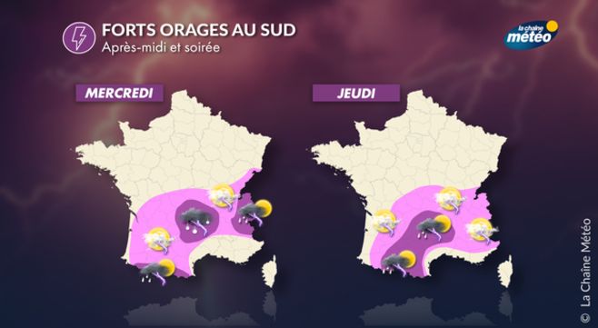 Mercredi et jeudi, il fera chaud, voire très chaud dans le sud. Cette chaleur sera rendue très lourde par l'humidité laissée par les orages. On attend 17 à 22°C la nuit et de 32 à 35°C les après-midi. La sensation d'inconfort thermique sera importante en fin de journée, avec un ressenti parfois proche de 40. Néanmoins, on se situera 2°C en-dessous des seuils de canicule.