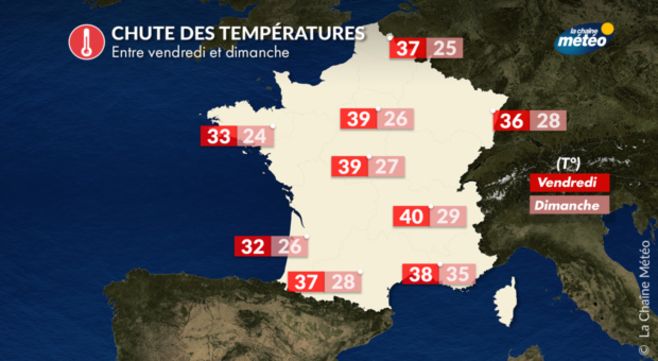 Dimanche, la baisse des températures gagnera quasiment tout le pays et l'on retrouvera des valeurs de saison. Les très fortes chaleurs ne concerneront plus que l'extrême sud-est.
