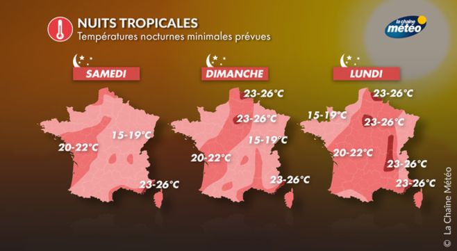 Une des caractéristiques de cette canicule, outre le fait qu'elle sera plus longue que la précédente, est la forte chaleur nocturne qui est attendue ces prochains jours, et qui donnera une ressenti tropical surtout dans les grandes villes et en périphérie, en raisons d'un fort taux d'humidité. Des records datant de 2003 pourront être approchés voir dépassés.