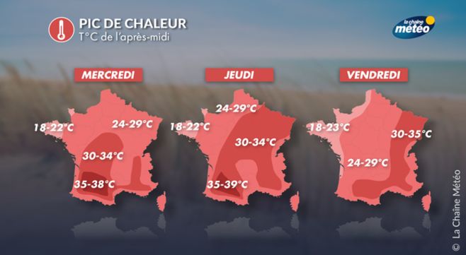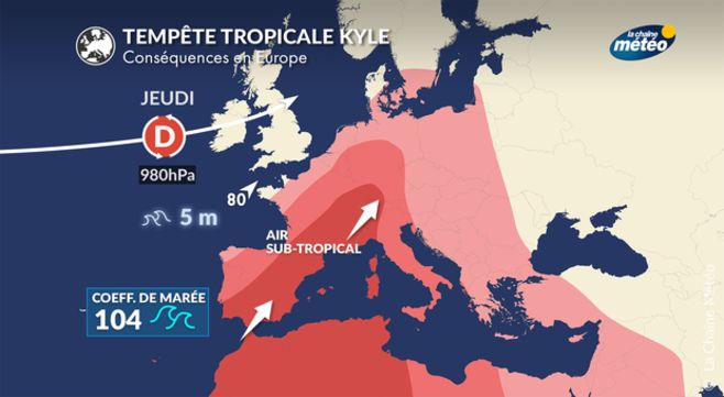 Jeudi, l'anticyclone remontera rapidement vers l'Allemagne alors qu'une dépression très creuse (l'ex tempête tropicale KYLE) viendra se positionner au large de l'Irlande. Cette situation provoquera un appel d'air très chaud en provenance du Maghreb, En conséquence, les températures s'envoleront avec 34 à 38°C du bassin aquitain à l'Auvergne-Rhône-Alpes. Près de la Manche, il fera beaucoup moins chaud avec 18 à 22°C seulement sous les nuages, le vent fort et les pluies. Ailleurs, l'ambiance sera lourde avec 28 à 32°C.