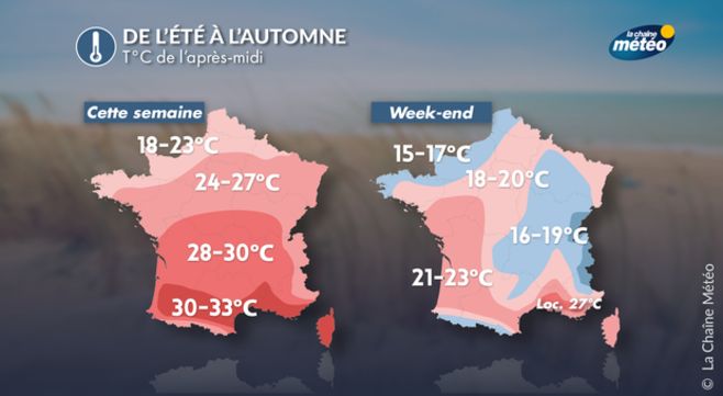 Avec un vent orienté au Nord, il fera très frais ! C'est surtout les après-midi, que la sensation de fraîcheur sera accentuée par les nuages, les averses et le vent du Nord. Les maximales afficheront 17 à 23°C du nord au sud, des valeurs inférieures de 3 à 5°C aux moyennes. Dimanche matin, il fera très frais avec des minimales parfois proches de 5°C au lever du jour dans les vallées d'Auvergne, en Normandie, en Bretagne, en Poitou ou en Sologne. Il est important de rappeler que ces premiers coups de fraîcheur sont tout à fait habituels en France à la fin du mois d'août.