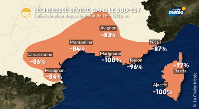 Si la sécheresse fait partie intégrante du climat des régions du sud-est, c'est la durée de la période sèche qui est remarquable cette année. A Marignane et Ajaccio, la dernière pluie remonte au 13 juin, ce qui fait 73 jours consécutifs sans pluie ! Marignane risque fort de battre son record de 75 jours consécutifs sans pluie qui a eu lieu du 25 juin au 7 septembre 1933. C'est l'ensemble du bassin méditerranéen qui subit un été extrêmement sec avec des cumuls de pluie généralement inférieurs à 10 millimètres depuis la mi-juin alors que la normale est d'environ 55 mm.