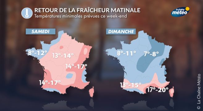 On retient de ce week-end le contraste des températures matinales entre ce samedi, où il fait encore très doux au lever du jour, et dimanche matin, où la fraîcheur sera de retour. Cela est dû à l'orientation du vent au secteur nord-ouest, concernant d'abord la moitié nord-ouest ce samedi puis les trois quarts du pays demain dimanche. Cependant, rien à voir avec le froid automnal du week-end dernier, d'autant plus que le temps reste plus calme avec de belles éclaircies.