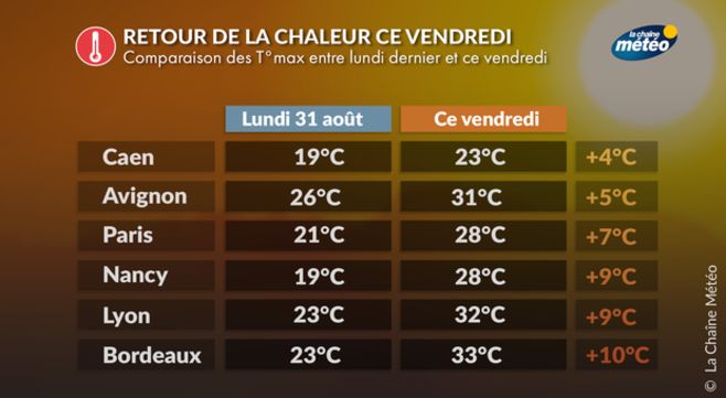 Ainsi, le contraste de températures entre lundi dernier, journée la plus fraîche, et ce vendredi, journée la plus chaude, atteint parfois 10°C.