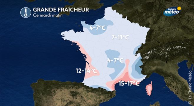 La fraîcheur est bien présente le matin sur les Alpes alors qu’il fait plutôt doux le long des littoraux. Dans l’après-midi, les maximales sont en légère hausse sur le sud-ouest et stationnaires en Méditerranée. Elles affichent 24 à 27°C.
