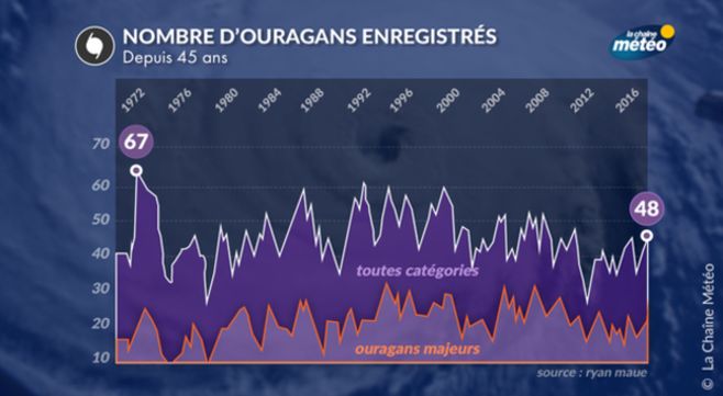 Contrairement aux idées reçues, le nombre total de phénomènes cycloniques est en légère diminution sur la planète depuis le début des relevés en 1851. Ce nombre était en augmentation dans l’Atlantique Nord entre 1950 et 1970 avant une baisse entre 1970 et 1990. La courbe est repartie à la hausse entre 1995 et 2010 avant cette dernière décennie anormalement calme. Le pic de 2017 marque donc un retour à la normale dans l’océan Atlantique Nord. Face à ce constat, la question du rôle du réchauffement climatique dans l’évolution du nombre d’ouragans en Atlantique Nord n’est pas probant, ce qui est reconnu à la fois par le GIEC (Groupe Intergouvernemental d’experts sur le climat) et par la NOAA, qui indique “ Il est prématuré de conclure que les activités humaines (et en particulier les émissions de gaz à effet de serre) ont un impact détectable sur les ouragans de l’Atlantique ou sur l’activité cyclonique mondiale .” (2). Le réchauffement climatique planétaire aurait plutôt tendance à augmenter la puissance des ouragans formés, qui atteignent plus rapidement les catégories maximales, ainsi que les cumuls pluviométriques associés, plus abondants d'environ 20 à 30 %.