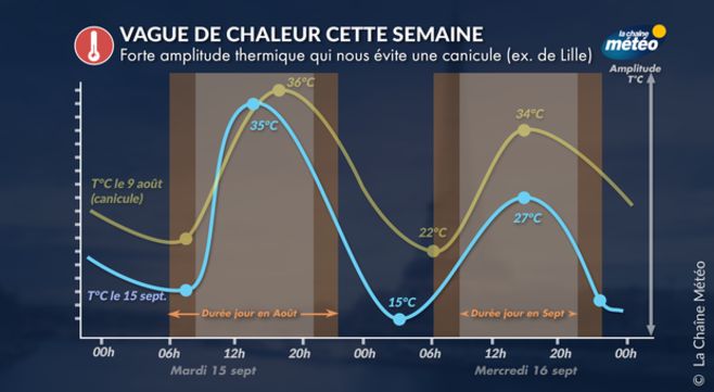 La vague de chaleur que nous connaissons est remarquable pour la saison. Même si de grandes vagues de chaleur se sont déjà produites dans le passé (1911, 1947, 1949, 1985, 1987, et, plus proche de nous, 2016), de nombreux records viennent d'être battus (avec notamment 35°C à Lille ce mardi). Cette vague de chaleur tardive aurait pu nous valoir une nouvelle canicule si elle était survenue en août, en raison des nuits plus courtes au coeur de l'été. En effet, en cette mi-septembre, les nuits sont déjà presque 2 heures plus longues qu'en août. Cela permet certes aux températures de baisser davantage en septembre qu'en août, mais n'évite pas les valeurs caniculaires en journée. Cela s'est donc traduit par de très fortes amplitudes thermiques entre les températures minimales et maximales, avec parfois plus de 20°C d'écart. Ces nuits moins chaudes qu'au coeur de l'été ont permis d'éviter d'atteindre les seuils de canicule, favorisant en même temps un meilleur confort nocturne.