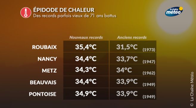 Mardi, de très nombreux records mensuels de températures ont été battus dans le nord et le nord-est du pays. Ce sont parfois des records vieux de plus de 70 ans qui sont tombés comme à Nancy (34,4°C contre 33,7°C en 1947), Lille 35,1°C (33,8°C en 1949), Beauvais 34,2°C (33,9°C en 1949) et Pontoise 34,9°C (33,9°C en 1949). Localement les records sont battus de plus de 3°C dans le Nord-Pas-de-Calais comme à Douai 35,1°C (32°C en 2013) et Roubaix 35,4°C contre 31,5°C en 1973).