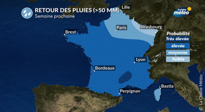 Lundi et mardi, il continuera à faire chaud avec 25 à 28°C en moyenne. Mercredi, les températures commenceront à baisser, avant de chuter jeudi. En fin de semaine prochaine, la fraîcheur sera particulièrement marquée et accentuée par les pluies parfois abondantes, les averses et le vent fort. Le ressenti pourra même paraître froid ! Les températures afficheront en fin de semaine de 13 à 22°C du nord au sud, des valeurs inférieures de 3 à 5°C aux normales de saison. On perdra localement 15°C entre lundi et vendredi prochain ! Cette évolution est due à l'arrivée d'une masse d'air polaire en prise directe du Groenland, qui descendra sur la France. En altitude, la masse d'air perdra environ 12°C à 14°C, ce qui influe les températures au sol et l'apparition de la neige en montagne.