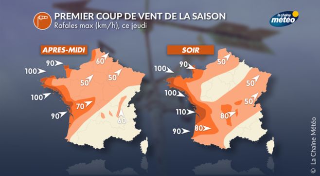 - de fortes rafales de vent l'après-midi et le soir sur les côtes de la Manche et de l'Atlantique avec des rafales entre 80 et 100 km/h. Consultez notre communiqué spécial vent fort