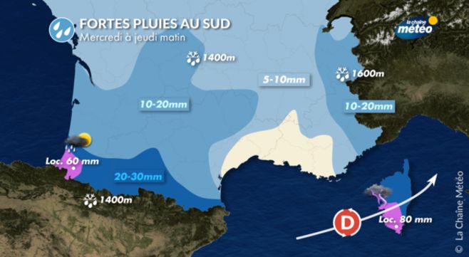 Une dépression s’enfonce en direction du sud-ouest du pays avec son lot de pluie en plaine et de neige en montagne du massif central aux Pyrénées. Le vent de nord-ouest soufflera assez fort sur les côtes atlantiques et de la Manche, en rafales à 50/60 km/h. Une autre dépression bien plus active se creuse vers les Baléares et remontent en direction de la Corse et du Golfe de Gènes. Cette dernière apporte une nette dégradation dans l’après-midi et la nuit prochaine sur l’île-de-beauté avec parfois de forts orages.