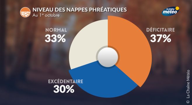 Après un été calendaire le plus sec jamais observé depuis 1959 en France, la situation hydrologique s'est nettement améliorée depuis le début de l'automne. Un temps durablement perturbé s'est installé depuis trois semaines avec de fréquentes précipitations qui ont mis fin à la sécheresse de surface. Pour autant, un tiers des nappes phréatiques conservaient un niveau déficitaire au 1er octobre.