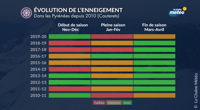 Le début de saison 2010-2011 a ressemblé à celui que nous connaissons dans les Pyrénées. Fin novembre, l'enneigement avait atteint celui d'un mois de janvier sur l'ouest de la chaîne pyrénéenne. Mais dès le début du mois de décembre, un temps doux et pluvieux a mis à mal le manteau neigeux. Par la suite, le temps a été durablement sec jusqu'à la mi février. Au coeur de la saison, l'enneigement a finalement été l'un des plus bas jamais observé en dessous de 2000 mètres d'altitude. Il a fallu attendre la toute fin du mois de février et le début du mois de mars pour retrouver des chutes de neige conséquentes, mais le redoux au début de printemps a rapidement fait fondre la neige. La saison de sports d'hiver 2010-2011 a finalement été l'une des plus défavorables sur le massif pyrénéen.