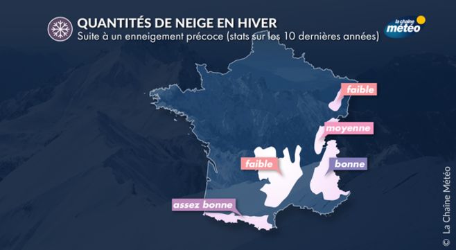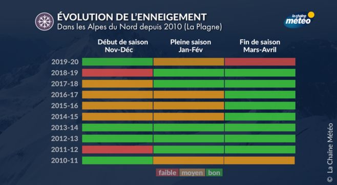 Dans les Alpes du Nord, les deux dernières saisons de sports d'hiver ont connu un déficit d'enneigement important en début de saison mais les précipitations neigeuses ont fait leur retour de manière assez fréquentes au coeur de l'hiver avec des fluctuations importante de la limite pluie-neige. Au final le bilan a été positif à moyenne et haute altitude, plus difficile pour les stations situés à basse altitude. Si l'on prend maintenant l'exemple de la saison 2010-2011, on a observé un enneigement précoce sur les Alpes du nord avec plusieurs offensives neigeuses dès l'automne. Par la suite, la situation se dégrade avec des redoux pluvieux et un enneigement qui devient déficitaire dès Noël. En janvier et février des conditions anticycloniques s'installent durablement si bien qu'à la fin du mois de février, l'enneigement est l'un des plus faibles pour cette époque de l'année. Les quelques chutes de neige observées en mars ne suffiront pas à rétablir un enneigement correct. Au final, la sécheresse de cet hiver aura été la principale responsable d'un hiver très déficitaire en neige sur nos montagnes.