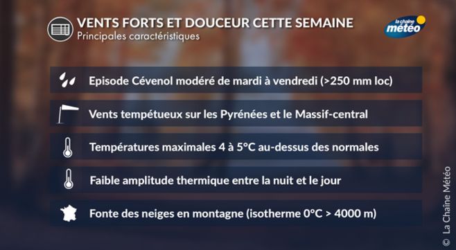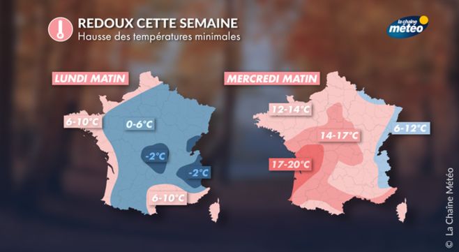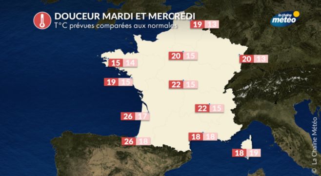 Avec le vent orienté au sud, il fera de plus en plus doux. On ne parlera plus de gelées en plaine le matin avec 8 à 16°C au lever du jour. L'après-midi, les maximales s'échelonneront de 17 à 22°C du nord au sud avec des pointes entre 23 et 27°C ponctuellement mardi et mercredi sur le Midi toulousain et dans les vallées foehnées d'Auvergne. On attend 20°C à Paris, Lille et Strasbourg, un niveau de début septembre. On se situera entre 3 et 5°C au-dessus des moyennes de saison. On repassera donc au-dessus des normales, excepté près de la Méditerranée en raison des entrées maritimes ainsi qu'en Bretagne sous la pluie. Malgré la douceur, le ressenti ne sera pas très agréable au vent d'Autan qui sera souvent bien présent tout au long de la semaine.
