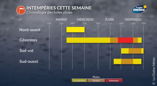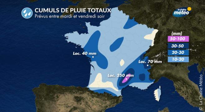 Dans ce flux de sud à sud-est remontant de la Méditerranée, l'humidité sera bloquée par les Cévennes, provoquant des pluies régulières mais plutôt faibles à modérées. De mardi à jeudi, les cumuls pourront tout de même avoisiner 100 à 150 mm sur la montagne cévenol. Une recrudescence des pluies aura lieu vendredi, lorsque le front froid balaiera tout le sud de la France : prenant un caractère orageux, l'épisode de vendredi sera assez intense et sera à surveiller, pouvant apporter un cumul supplémentaire de 100 mm.