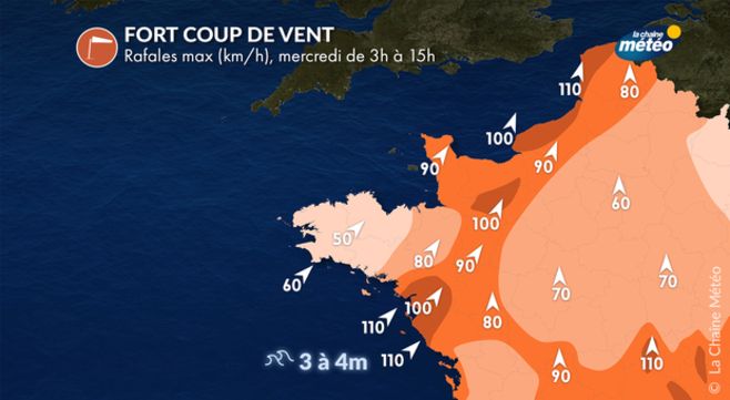 Dès ce mardi soir, dans la nuit et jusqu'à ce mercredi matin, au passage de la dépression Barbara qui passera au plus près dans le Golfe de Gascogne, un bref coup de vent se produit au centre-ouest (Charentes, Vendée, Deux-Sèvres). Les rafales maximales pourront atteindre 100 à 110 km/h, ce qui n'est pas anodin. La marée haute du soir, vers 20 h, sera encore d'un fort coefficient (93) mais sera donc décorrelée du maximum des vents, se produisant entre minuit et 03 h du matin. Ensuite, ce mercredi matin, les vents forts, tout en faiblissant un peu, se propagent sur les Normandie et vers les Hauts de France, notamment la Côte d'Opale. Ces vents forts s'évacuent ensuite vers la Belgique en cours d'après-midi.
