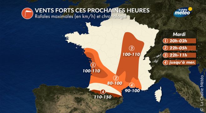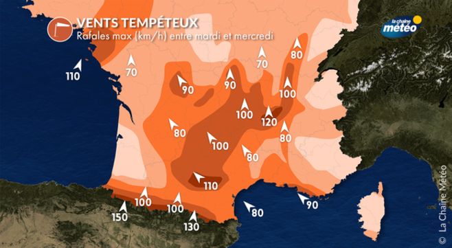 Après une journée de mardi déjà ventée, le vent du sud se renforcera encore davantage mardi soir et soufflera en tempête sur la chaîne pyrénéenne avec des rafales pouvant atteindre 150 km/h dans la nuit de mardi à mercredi et mercredi près des plus hauts sommets. Dans certaines vallées orientées dans le sens du vent, le foehn déferlera et pourra atteindre 110 km/h du côté de Bagnères-du-Luchon (31) par exemple. Sur le sud du Massif central, le vent d'Autan atteindra fréquemment les 110 km/h en montagne, sur la Montagne Noire, le plateau du Larzac et le Cézallier.