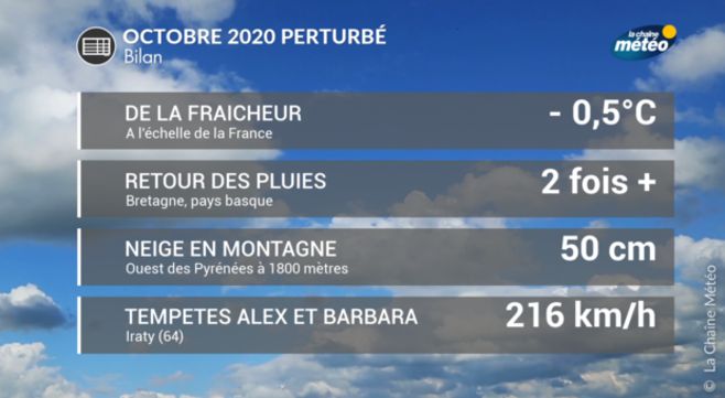 Avec ces basses pressions persistantes et une importante masse nuageuse, l'ensoleillement s'est montré déficitaire sur la France. Au passage des perturbations les plus fortes, deux tempêtes ont concerné une grande partie du pays, Alex (le 3 octobre) et Barbara (le 20 octobre), avec des rafales qui pour les plus violentes ont atteint plus de 200 km/h dans les Pyrénées-Atlantiques (216 km/h à Iraty à 1400 mètres d'altitude) et 186 km/h à Belle île en mer (86)
