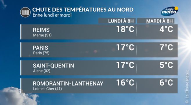 La baisse des températures est brutale en ce début de semaine puisque l'on passe en quelques heures d'une masse d'air subtropicale (flux de sud à sud-ouest) à une masse d'air d'origine polaire maritime (flux d'ouest à nord-ouest). Ainsi, à Reims en Champagne, on est passé de 18°C lundi matin à 8h à 4°C ce mardi matin à 8 heures, soit 14°C de moins en 24 heures ! A Paris on est passé de 17°C à 7°C sur la même période, soit une baisse de 10°C. Cette situation météo n'est pas rare à cette époque de l'année où l'on peut encore subir des remontées d'air particulièrement doux suivis des premières descentes d'air très frais en provenance d'Islande.