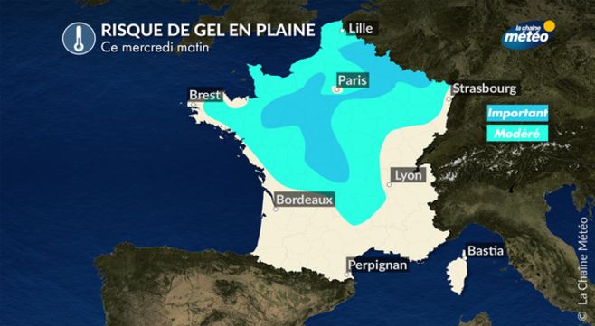 Avec le retour de conditions anticycloniques entre mercredi et vendredi sur notre pays et en présence d'un air d'origine continentale apporté par un léger flux d'est, les nuits s'annoncent souvent dégagées ces prochains jours et notamment sur une large moitié nord où le rayonnement nocturne sera important. Ainsi, les basses couches de l'atmosphère se refroidiront fortement et des gelées blanches feront leur apparition sur de nombreuses régions. Dès mercredi matin, quelques gelées pourront s'observer dans les plaines et vallées abritées entre la Normandie et la Belgique. Jeudi matin sera sans doute la matinée la plus froide à l'échelle de la France avec des gelées fréquentes du centre au nord et au nord-est. Il s'agira de faibles gelées comprises le plus souvent entre 0 et -2°C. Il faudra néanmoins penser à rentrer vos plantes qui peuvent craindre ces premières gelées blanches.