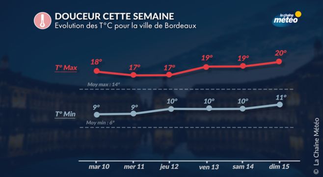 Les dépressions atlantiques tournoyant tout au long de la semaine sur le proche Atlantique, elles dirigeront vers nous un flux de sud-ouest. Nous baignerons ainsi dans une masse d’air tout droit venue du Maroc avec des températures situées au-dessus des normes. Il faut ainsi s’attendre à des valeurs 4 à 5 degrés supérieures aux normes de saison les après-midis, proches des 18 à 20°C dans le Sud et des 14 à 16°C dans le Nord, même si une baisse temporaire est attendue sur ces régions entre mercredi et jeudi. En matinée, les gelées ne seront pas encore à l’ordre du jour.