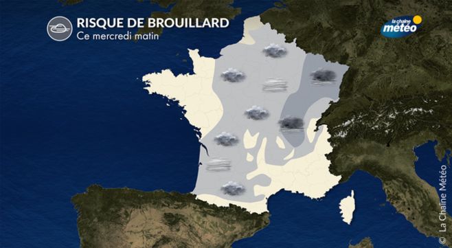 Ce mercredi, les conditions météo restent anticycloniques sur le pays avec un temps calme mais pas forcément ensoleillé car les nuages bas et brouillards sont fréquents et parfois tenaces, notamment en matinée. Dans l'après-midi, les éclaircies dominent le plus souvent au sud de la Loire. Dans le nord-ouest, le temps commence à changer avec l'arrivée d'une perturbation sur l'ouest de la Bretagne avec de la pluie et un vent de sud assez fort.