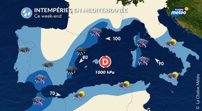Une forte dégradation du temps est attendue sur l’ouest du bassin méditerranéen ce week-end en raison de la mise en place d'un système dépressionnaire orageux. Localisé jusqu'à vendredi du sud du Portugal à l'Algérie, il se décalera durant le week-end vers le sud des Baléares, la Sardaigne puis le sud de l'Italie. Cette situation est propice à de fortes pluies orageuses en Méditerranée et un risque important d'inondations sous les plus forts orages.