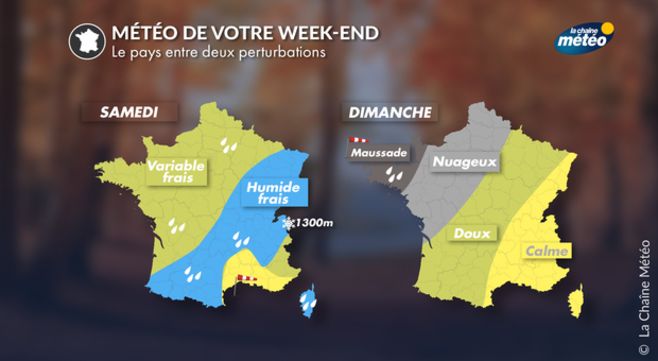 Pour votre week-end (samedi 12 et dimanche 13 décembre), le temps perturbé se prolonge ce samedi avec de la pluie du sud-ouest au nord-est et de la neige en montagne. Demain dimanche, le temps sera plus sec et lumineux au sud à l'avant d'une nouvelle perturbation sur le nord-ouest.