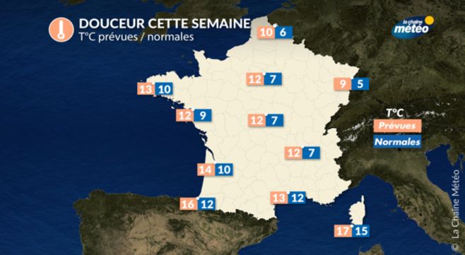 La semaine est marquée par la douceur, malgré les nuages et quelques passages pluvieux. Une douceur liée au vent de sud-ouest. Le matin, on ne parle quasiment plus de gelées en plaine. L'après-midi, les maximales affichent de 11 à 17°C, soit 5°C au-dessus des moyennes, approchant souvent un niveau de début de mois de mars.