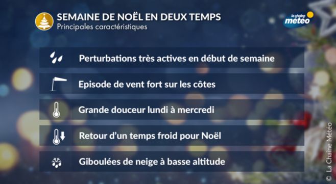 Cette semaine, le temps reste assez perturbé. Les passages pluvieux sont plus fréquents au nord qu'au sud. Les cumuls de précipitations s'annoncent ponctuellement importants au nord de la Loire. Ce temps perturbé au nord, d'abord doux, se refroidira pour Noël avec de la neige qui fera son apparition à assez basse altitude.