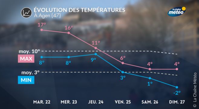 Jusqu'à mercredi, le vent de sud maintiendra un temps très doux. Le matin, aucune gelée n'est prévue avec 6 à 12°C au lever du jour. L'après-midi, les maximales afficheront de 12 à 15°C du nord au sud, un niveau de début de mois de mars. Dans le sud, le ressenti sera véritablement printanier avec des températures entre 16 et 18°C localement. Sous les pluies du nord, la douceur sera trompeuse à cause des pluies et du vent. A partir de jeudi, avec l'orientation brutale du vent au Nord en toute région, les températures chuteront de 5 à 10°C par rapport à la veille. Vendredi, on se situera entre 2 et 3°C normales de saison.