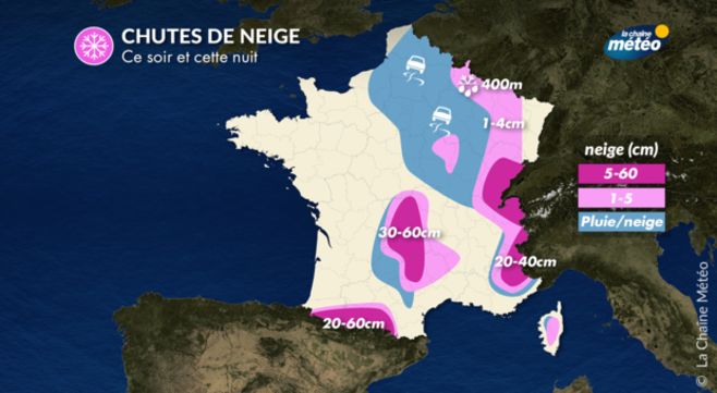 De la Nouvelle Aquitaine aux Pyrénées à l'ouest de l'Auvergne, le temps est très agité, avec des précipitations abondantes. Il neige abondamment en montagne au-dessus de 600 à 800 mètres. Des conditions de blizzard frappent l'ouest du Massif central et les Pyrénées occidentales avec 30 à 50 cm de neige fraîche possibles dès 1000 mètres d'altitude. Sur le bassin aquitain, le vent souffle très fort, à 110 km/h en rafales et 80 à 90 km/h dans les terres. Ce matin, il fait 1 à 5°C et de 5 à 8°C l'après-midi.