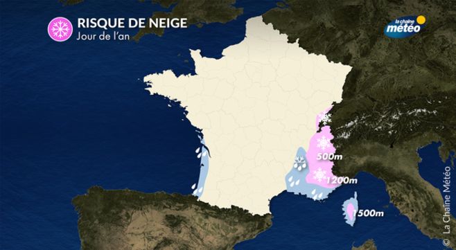 Un puissant anticyclone s’étend des Açores à l’Islande, d’où le flux de nord perturbé sur notre pays. Avec l’arrivée de l’air froid sur la Méditerranée, une dépression se creuse entre les Baléares et la Corse et apporte des pluies parfois soutenues entre l’île de beauté et le littoral de la Côte d’Azur. Il neige en montagne sur les Alpes-du-Sud et sur la Montagne Corse mais la limite pluie/neige s’abaisse nettement en soirée, si bien que la pluie se mêle à la neige jusqu’en vallée du Rhône. Ailleurs, le temps est plus calme et froid avec de nombreux brouillards givrants et quelques giboulées sur les côtes de la Manche principalement.