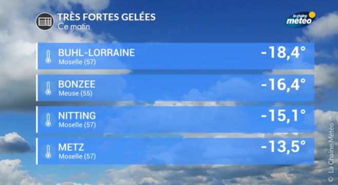 Le froid est remarquable dans le nord-est de la France avec de très fortes gelées dans l'Est. On relève -18,4°C à Buhl-Lorraine (57) ou bien encore -13,5°C à Metz.