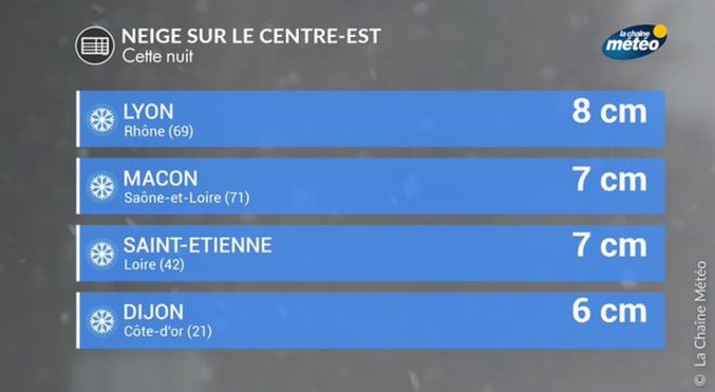 Voila le bilan des chutes de neige de samedi dans le nord, qui se sont prolongées dans la nuit de samedi à dimanche en Bourgogne et sur l'Auvergne-Rhône-Alpes avec 17 cm à Bourg-Saint-Maurice (73), 10 cm à Ambérieu (01), 8 cm à Annecy (74) et Chambéry (73), 7 cm à Grenoble (38), 6 cm à Dijon (21 ) et Mâcon (71), et 3 cm à Vienne (38).