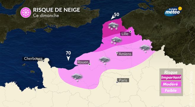 Demain dimanche, la perturbation qui concernait l'ouest du pays samedi se retrouvera sur la façade est du pays avec des pluies parfois soutenues et une limite pluie-neige qui s'abaissera vers 1200 m sur le Jura et les Alpes. De fortes averses orageuses concerneront l'extrême sud-est et la Corse. Dans l'ouest et le nord-ouest on retrouvera un temps instable avec des averses sous forme de pluie ou même de neige fondue sur les collines bretonnes et normandes. De la neige venant de Belgique s'invitera sur les Hauts de France dès la nuit de samedi à dimanche, en marge d'une tempête de neige qui se déclenchera sur les pays du Bénélux. Sur les régions centrales, le temps s'annonce plus calme et relativement sec. Les températures seront en baisse généralisée et ne dépasseront plus 4 à 6°C dans le nord-ouest et de 6 à 10°C sur les autres régions, 10 à 15°C dans l'extrême sud-est