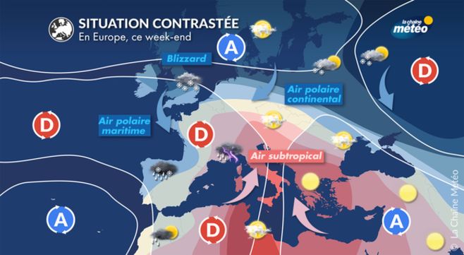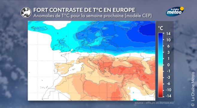 Un très fort contraste de température est désormais en place sur le continent européen, avec de l'air anormalement doux englobant le Maghreb, la Méditerranée et le sud de la France tandis que de l'air très froid s'accumule sur la Scandinavie pour descendre vers le Danemark, la mer du Nord, îles britanniques. Le nord de la France est également touché par un froid de plus en plus vif cette semaine.