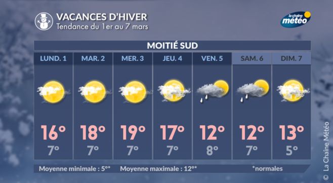 Comme pour la moitié nord, le sud bénéficiera des hautes pressions du centre de l'Europe avec un retour massif du soleil dès lundi. Néanmoins, le flux qui s'orientera au sud apportera de l'humidité sous forme d'entrées martitimes près du Golfe du Lion. Côté températures, on attend un pic de douceur ce mercredi mais rien à voir avec celui de la semaine écoulée. On devrait cependant atteindre les 21°C au sud-ouest. La deuxième partie de semaine pourrait être plus mitigée avec plus de nuages et le retour de quelques pluies accompagnées d'une nette baisse des températures. On regagnerait tout simplement les normales pour un début mars. Le dernier week-end des vacances serait alors souvent maussade, pluvieux et plus frais (fiabilité encore limitée). Une chose est sûre, les températures baisseront et les incertitudes résident plutôt dans l'intensité de la dégradation.