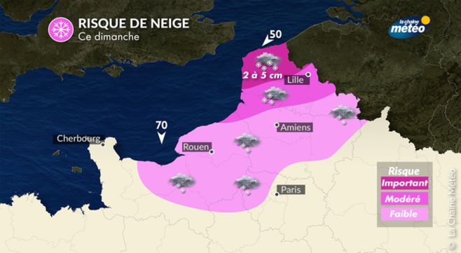De la Basse-Normandie au bassin parisien à la Champagne, le temps est gris et humide. Quelques bruines floconneuses sans incidence se produisent dans une ambiance refroidie par rapport à samedi. En soirée, avec la baisse des températures, des chutes de neige, faibles, finissent par s'imposer, saupoudrant les plateaux franciliens et les collines normandes. Les températures maximales affichent 1 à 4°C cet après-midi.